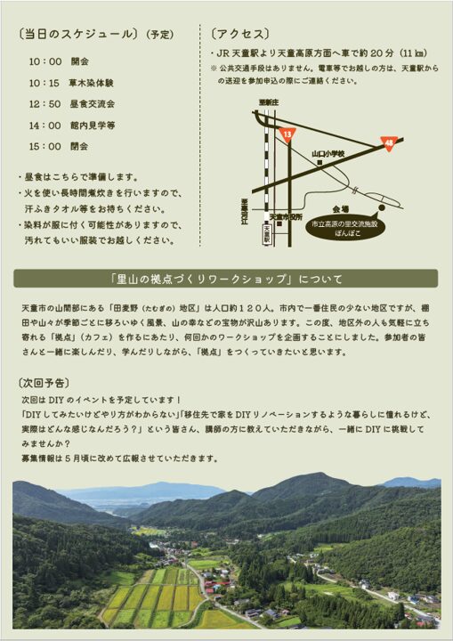 天童市田麦野地区では、山形県村山総合支庁と連携し、中山間地域の空き家や里山資源を活用した「地域の拠点づくり」のプロジェクトが進められています。